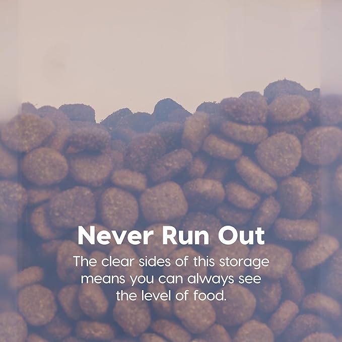 - CLEAR CONTAINER BODY: The translucent body allows you to check the food level in just one glance. Quickly check the remaining amount before you head to the pet store.