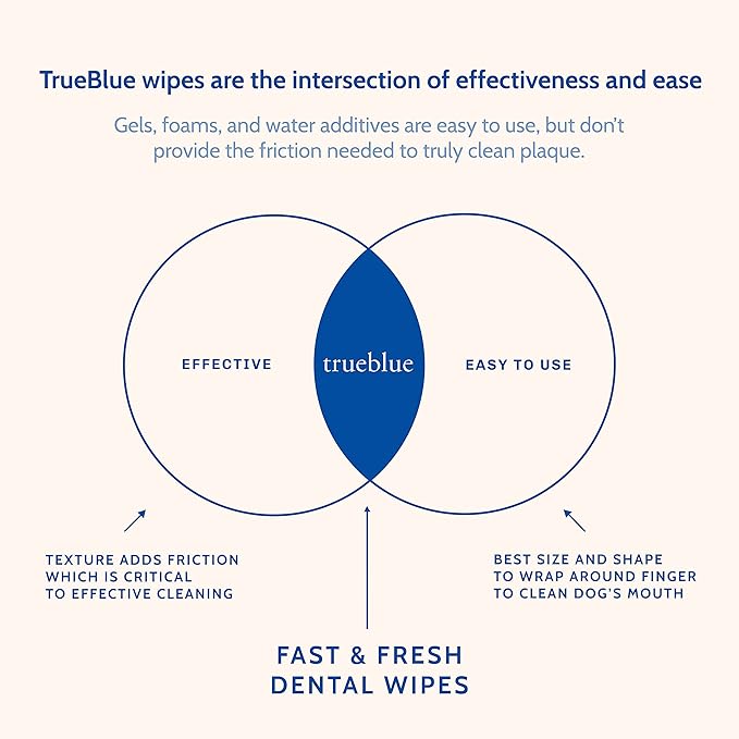 - NECESSARY DENTAL CARE: Your canine companion needs regular dental care in between professional cleanings and these Fast and Fresh Dog Dental Swipes from TrueBlue with Parsley & Peppermint are the perfect solution. Our hard-working textured pads are as effective as brushing, but much easier to use!