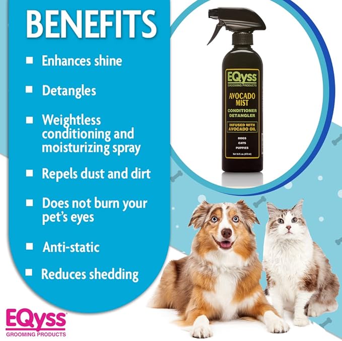 - Detangles & Conditions Coat: EQyss Avocado Mist Pet Coat Spray is a botanical leave-in conditioning spray that helps maintain the moisture balance in your pet's coat, making it great for detangling, reducing shedding, minimizing breakage, conditioning, and adding shine. Replenishes natural oils lost in shampooing without adding weight to the hair!