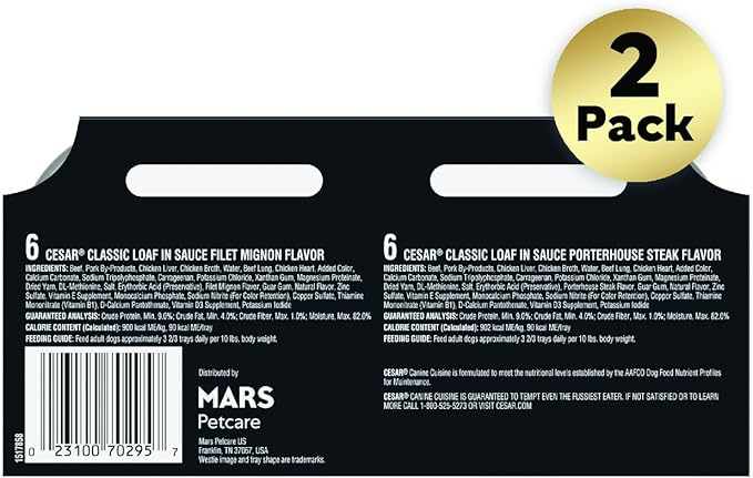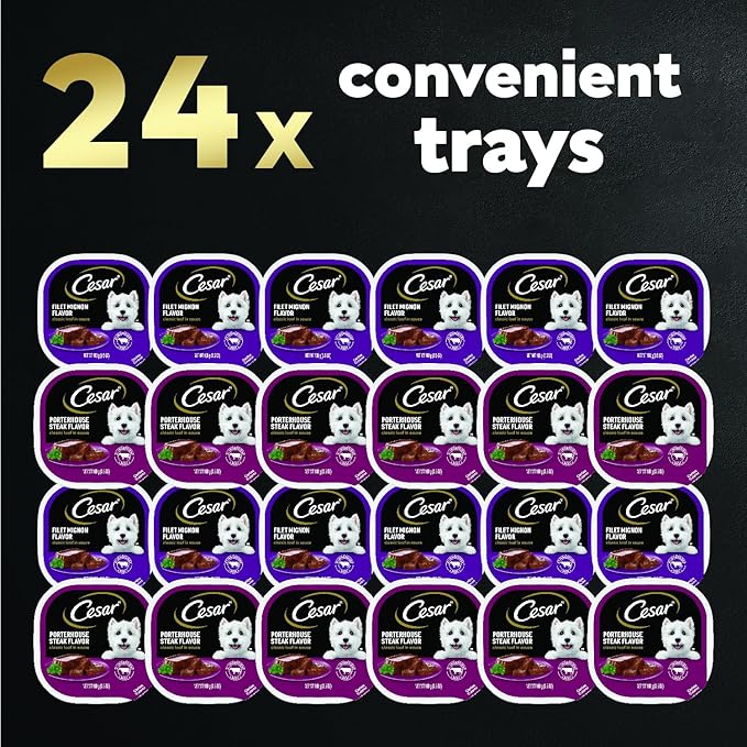 Cesar Wet Dog Food Classic Loaf in Sauce Filet Mignon and Porterhouse Steak Flavors Variety Pack, 3.5 oz. Easy Peel Trays (12 Count, Pack of 2)