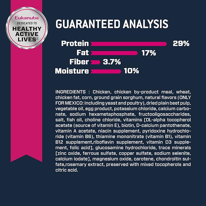 - Helps keep joints mobile and supports lean muscles in active seniors with chondroitin sulfate and 50% more glucosamine (vs. Eukanuba Small Breed dry dog food)