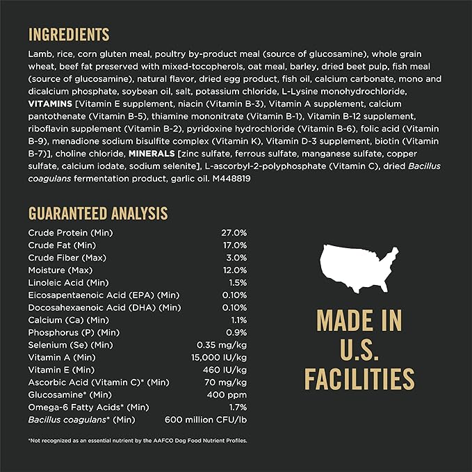 - High protein dog food with real lamb as the first ingredient to support strong muscles.