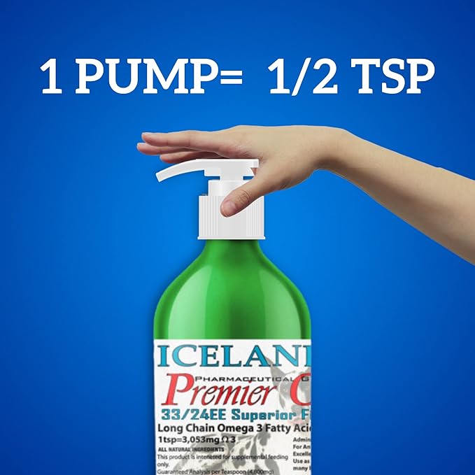 Premier Omega Fish Oil Supplement by Iceland Pure | Wild Caught | 3053mg of Omega-3 per teaspoon | For Large Dog Breeds | Ethyl Ester Distillation | Pump Bottle BPA Free Brushed Aluminum 17Oz