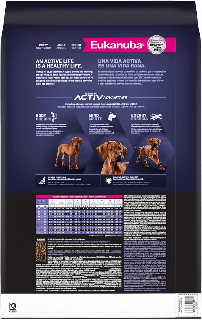 - FOR LARGE BREED PUPPIES: Eukanuba Large Breed Dog Food Dry Puppy Formula delivers complete and balanced nutrition for large breed puppies up to 15 months old with an expected adult weight over 55 lbs