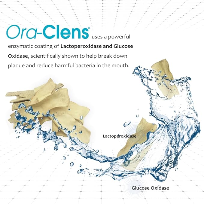 - 🧼 Effective Cleaning: Ora-clens Oral Hygiene Chews formula features a blend of the enzymes Lactoperoxidase and Glucose Oxidase, which help prevent plaque and tartar build up as well as promote clean teeth and fresh breath. With the enzymes coated onto the chews, your dog will gain benefits faster. Oral Hygiene Chews also feature an abrasive texture, which help scrub your dog's teeth while they chew.
