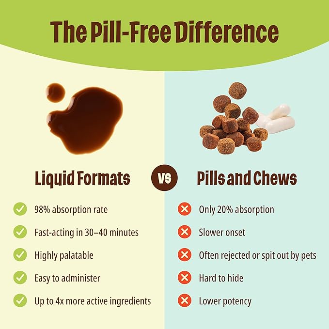 - Pill-Free administration process allows for 98% absorption rate vs. 20% with pills and chews. In other words, LICKS is up to 10x's more effective than pills or chews!