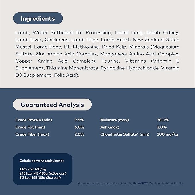 - HIGH PROTEIN, NUTRIENT DENSE, MOISTURE RICH: Featuring free-range Lamb, Organs, Bone, and New Zealand Green Mussels, this grain-free pate style cat food delivers premium nutrition with a mouth-watering taste for all cats and life stages. This moisture rich, chunky-loaf canned cat food uniquely support cat hydration.