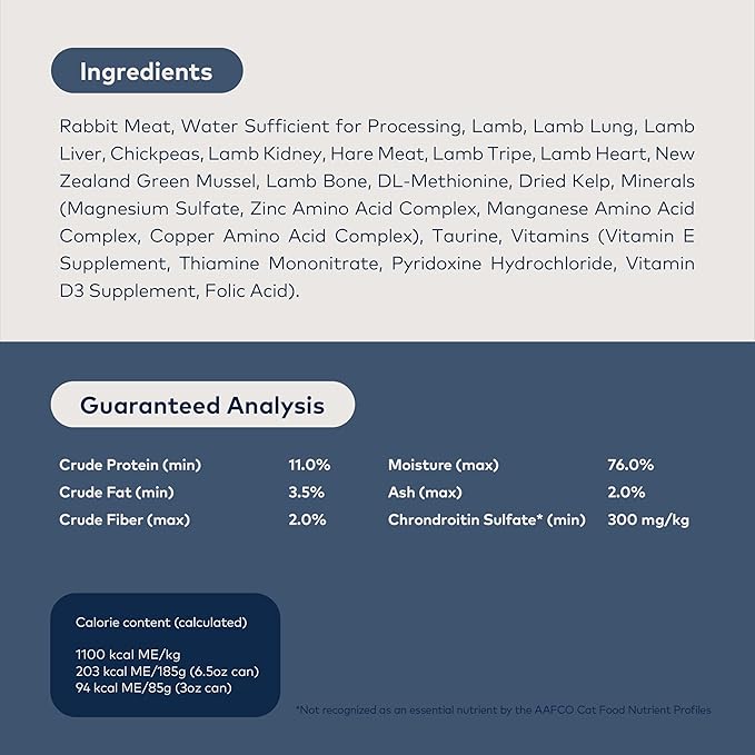 - HIGH PROTEIN, NUTRIENT DENSE, MOISTURE RICH: Featuring free-range Rabbit & Lamb, Organs, Bone, and New Zealand Green Mussels, this grain-free pate style cat food delivers premium nutrition with a mouth-watering taste for all cats and life stages. This moisture rich, chunky-loaf canned cat food uniquely support cat hydration.