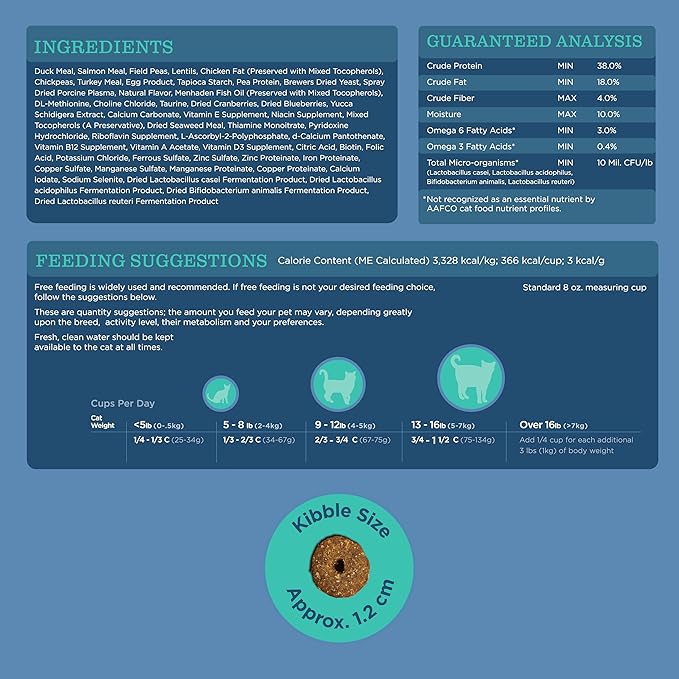 - Grain-Free Dry Cat Food for Food Sensitivities: Our slow cooked, grain free cat food is handcrafted with the natural goodness of duck, salmon, field peas, carrots, spinach, and blueberries; our cat food never contains corn, wheat, or soy making it the perfect solution for food sensitivities
