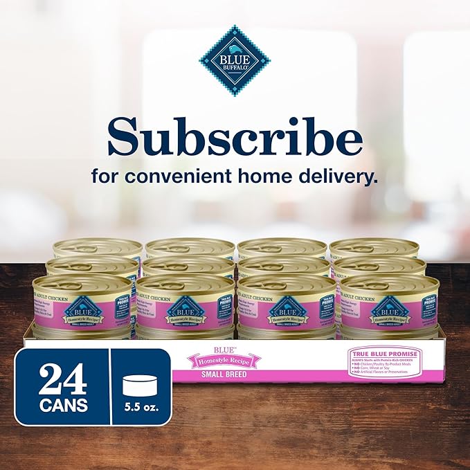 - Contains: Twenty-four (24) 5.5-oz cans of BLUE Homestyle Recipe Small Breed Adult Wet Dog Food, Chicken