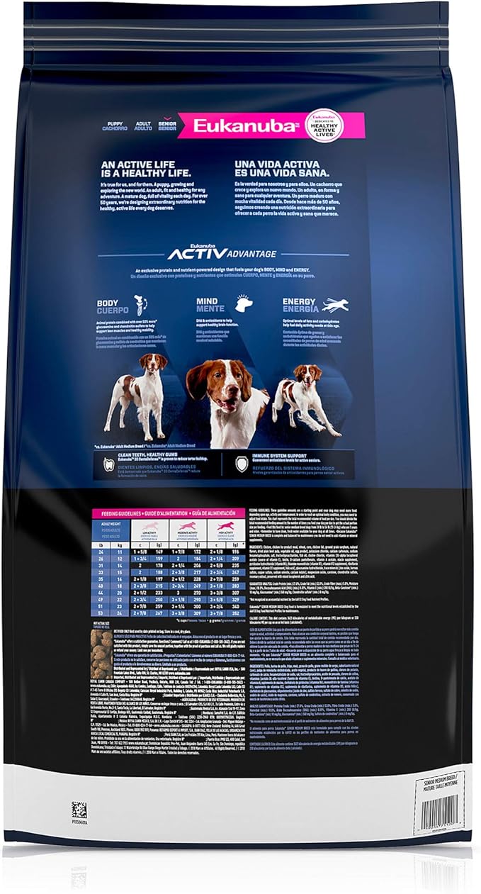 - FOR MEDIUM BREED SENIOR DOGS: Eukanuba Senior Medium Breed Dry Dog Food is complete and balanced nutrition for senior dogs over 7 years old weighing between 24 and 54 lb
