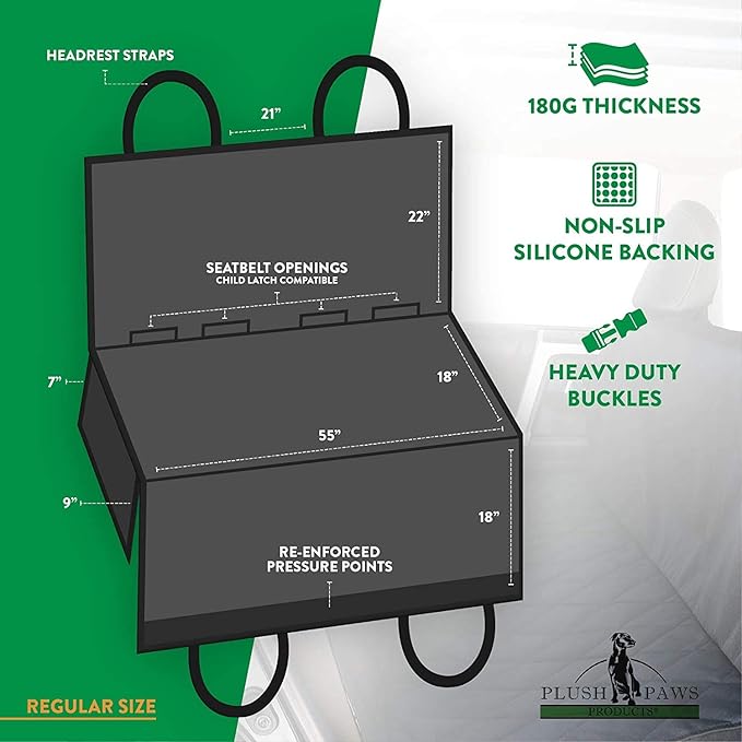 - πππ¦π¬ π§π’ ππ‘π¦π§πππ: Our sizes options are SMALL - 50"W X 60"L, REGULAR - 55''W X 58''L, LARGE, EXTRA LARGE - 65''W X 63''L, and all have 9'' X 18'' SIDE FLAPS. This elastic skirt and adjustable back and headrest straps provide a seamless clean look and snug fit. Buckle the dog car seat protector to your back seat using the adjustable back strap and insert the seat anchors to secure the cover in place. The headrest strap fits most vehicles.