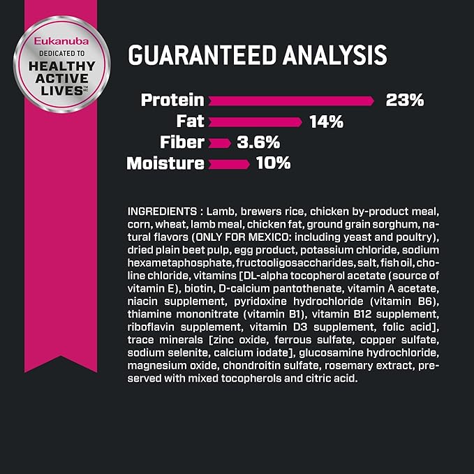 - COMPLETE AND BALANCED: Eukanuba Adult Lamb 1st Ingredient Dry Dog Food is complete and balanced nutrition for small and medium breed dogs over 12 months old and weighing up to 54 lb