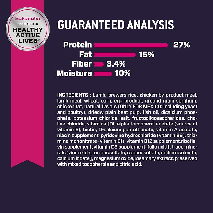 - COMPLETE AND BALANCED: Eukanuba Puppy Lamb 1st Ingredient Dry Dog Food is complete and balanced nutrition for small and medium breed puppies up to 12 months old with an expected adult weight up to 54 lb