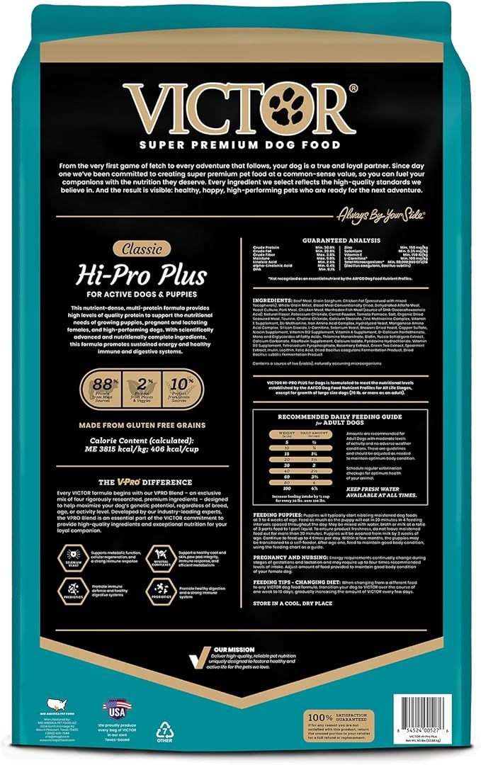 - ACTIVE DOG FOOD: VICTOR’s Hi-Pro Plus formula is a gluten free, high protein dog food with a nutrient-dense, multi meat formula; this dry dog food’s super premium nutrition provides sustained energy for sporting dogs and dogs with high physical demands