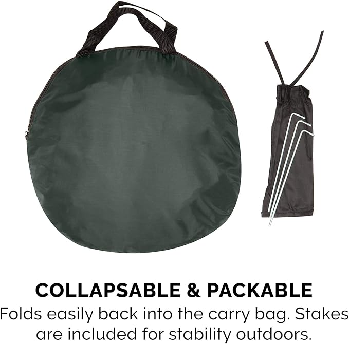 - PERFECT FOR TRAVEL: The playpen's pop-up design ensures that it can be set up, and put away, within seconds; the tent also comes with small metal stakes used to secure it to the ground, making it an ideal outdoor accessory for camping and picnics