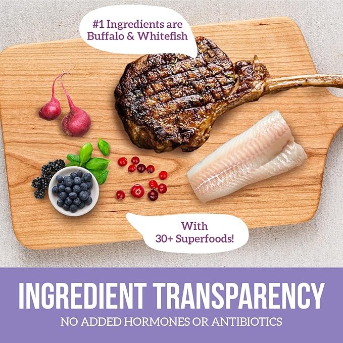 - Premium Protein Blend: Free-range buffalo and deboned whitefish provide nourishing animal protein to support lean muscle development and overall vitality in active dogs.