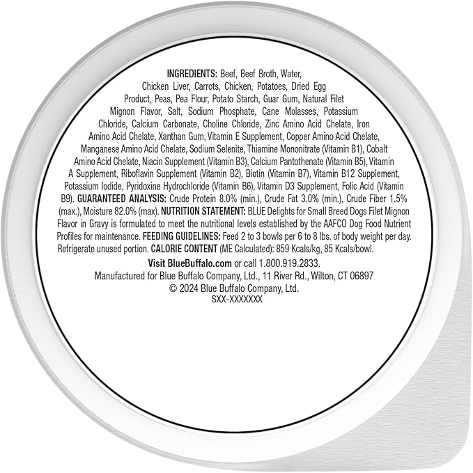 - Contains: Twelve (12) 3.5-oz cups of BLUE Divine Delights Small Breed Wet Dog Food, Filet Mignon Flavor in Hearty Gravy