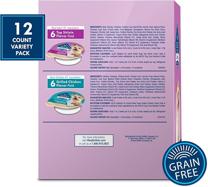 - Contains: Six (6) 3.5-oz cups of BLUE Delights Small Breed Wet Dog Food Top Sirloin Flavor Paté, and six (6) 3.5-oz cups of BLUE Delights Small Breed Wet Dog Food Grilled Chicken Flavor Paté (12 cups total)