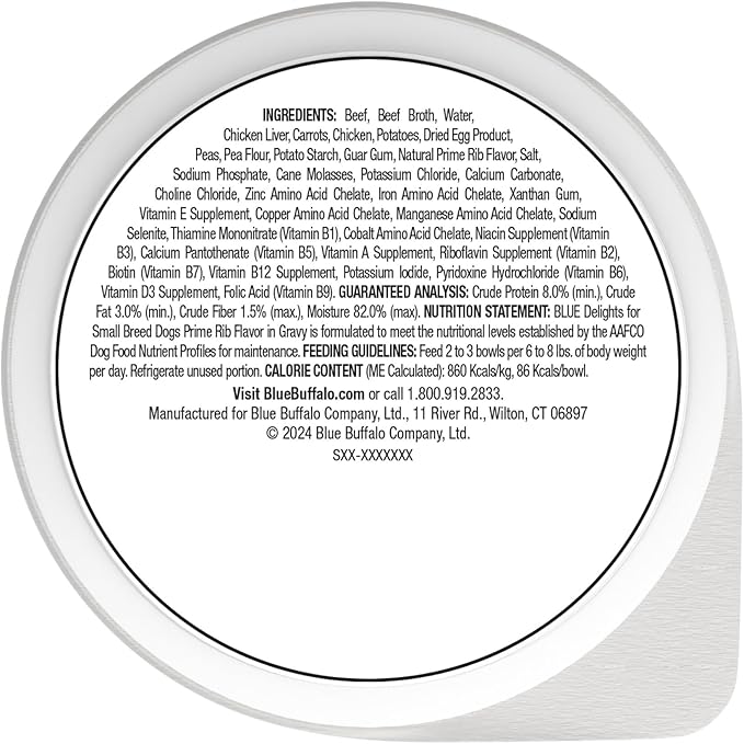 - Contains: Twelve (12) 3.5-oz cups of BLUE Divine Delights Small Breed Wet Dog Food, Prime Rib Flavor in Hearty Gravy