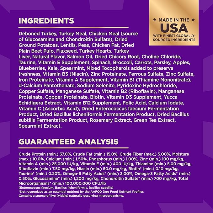 - SUPPORTS DIGESTIVE HEALTH AND HEALTHY COAT: Contains guaranteed levels of glucosamine for strong joints, probiotics for digestive health, omega fatty acids for healthy skin and coat, and taurine for a healthy heart.
