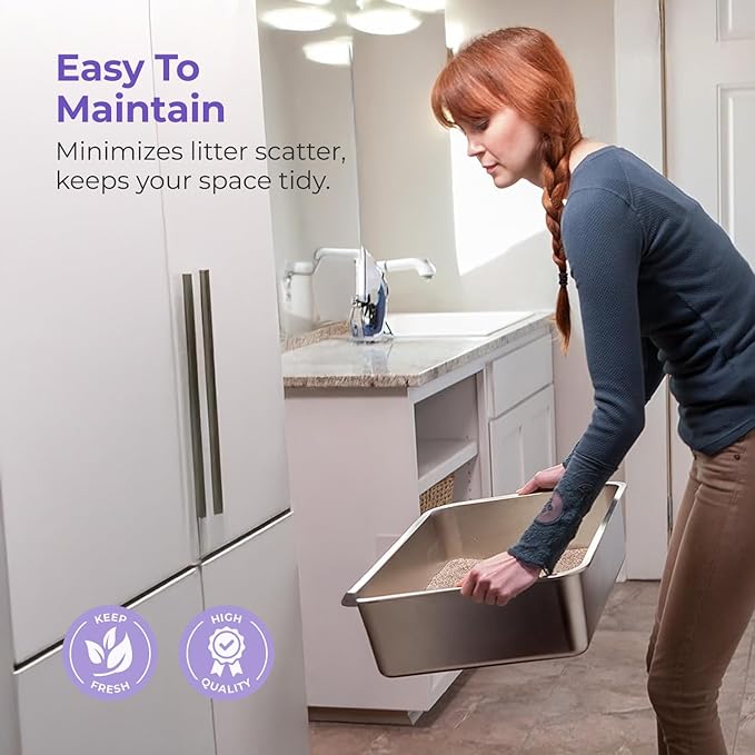 - STAINLESS STEEL & ERGONOMIC STRUCTURE - Crafted from rust-resistant stainless steel, our cat XL litter box ensures unrivaled durability. With an ergonomic design featuring rounded edges and enclosed sides, nothing will get stuck in hard-to-reach corners.