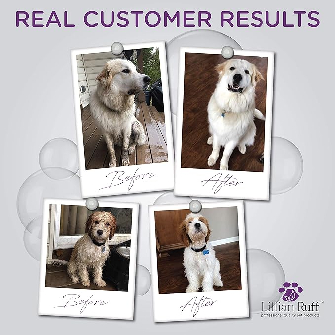 - Unrivaled Brightening Formula: Say goodbye to dull fur with our Coconut Brightening pet shampoo. Perfect for short to long coats, its unique formula produces a rich lather that rinses off effortlessly, brightening whites and enhancing coat colors. Unlike other whitening shampoos, Lillian Ruff Brightening Shampoo is suitable for all coat colors, ensuring a vibrant and refreshed look every time.
