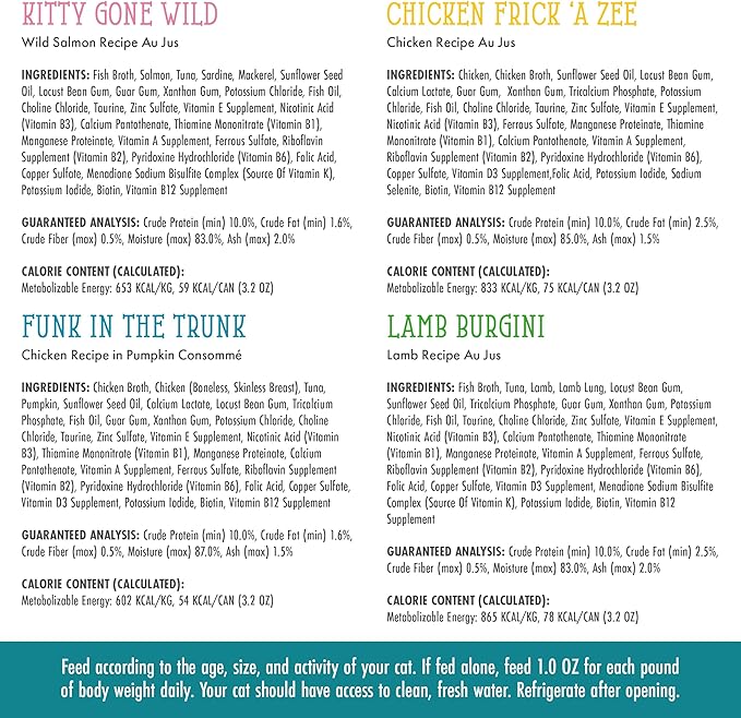 - Kitchen Cuties Variety Pack, (6oz Can, Pack of 24) Featuring a variety of wild salmon, cage free chicken and lamb in a delicious Au Jus. An all natural blend of premium proteins that cat’s can't resist!