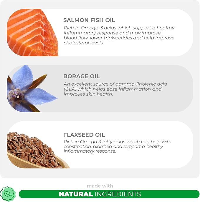 - Immune System - Our natural formula contains Vitamin E which is a powerful antioxidant that supports and enhances your dog’s immune system while also having Borage Oil which has anti-inflammatory properties.