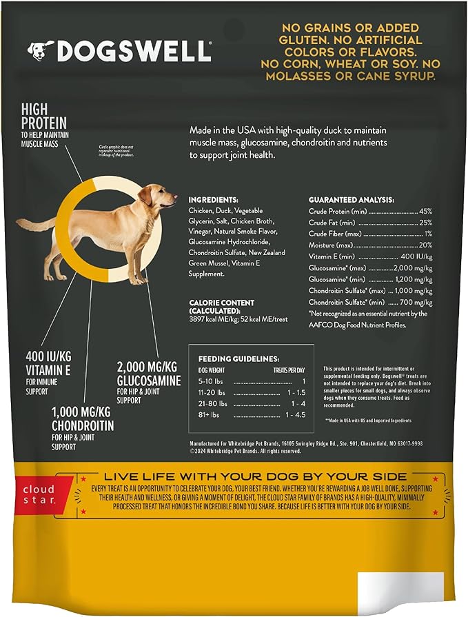 DOGSWELL Jerky Hip and Joint Dog Treats Grain Free Made in USA Only, Glucosamine and Chondroitin, 10 oz Duck (842194)