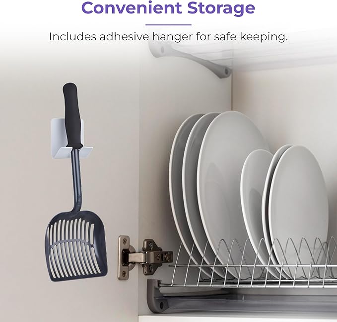 - INCLUDES HANGER FOR SAFE HOLDING OF SCOOPER: To make it easy to store the scoop while not in use, it comes with an adhesive plastic hanger that can attach to the wall or side of the litter box