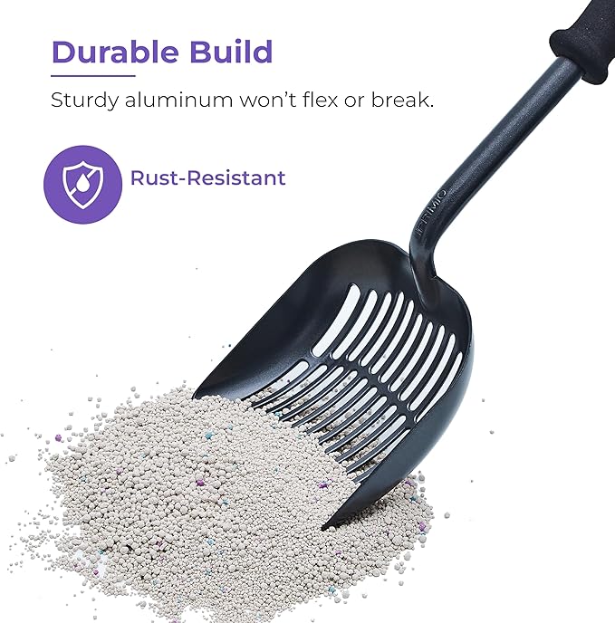 - WELL BALANCED AND STURDY; NOT SO HEAVY: You don't have to get quite so up close and personal with the contents in the litter box. Made from Sturdy aluminium, Meaning that it won't flex or break during use
