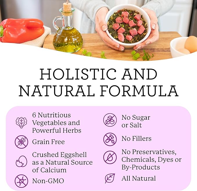 - This 6 pound bag of dehydrated whole foods makes 56, one pound meals when combined with a protein of your choice. Guaranteed Analysis: Crude Protein (min) - 13%, Crude Fat (min) - 1%, Crude Fiber (max) - 12%, Calorie Content (Calculated) - 2617 kcal ME/kg; 54 kcal ME/scoop
