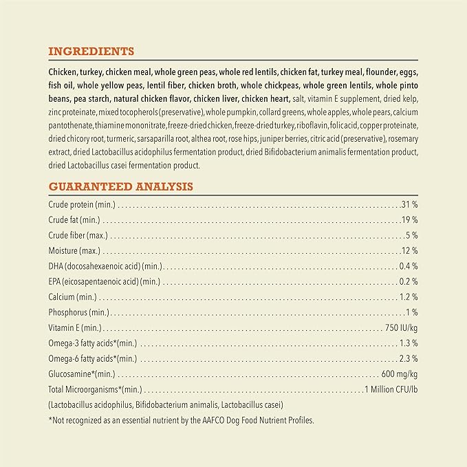 - High protein dog food recipe features free-run chicken and free-run turkey and eggs and is balanced to include 65%** high-quality animal ingredients and 35%*** wholesome fruits, vegetables and nutrients