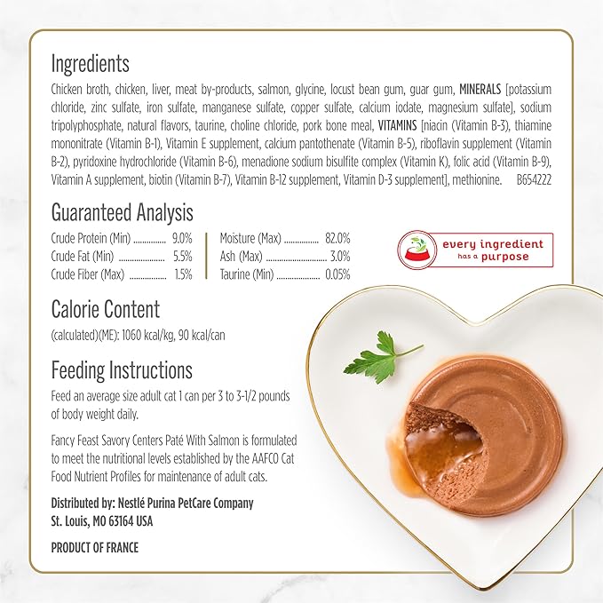 - COMPLETE AND BALANCED: Made with salmon cat food with a gravy center makes mealtime exciting while delivering 100 percent complete and balanced adult nutrition.
