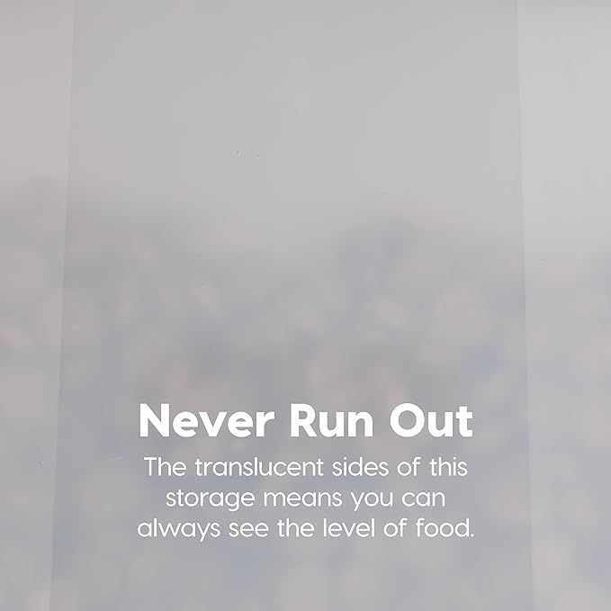 - CLEAR CONTAINER BODY: The translucent body allows you to check the food level in just one glance. Quickly check the remaining amount before you head to the pet store. Designed with a wide top and secure latch for easy opening, scooping and cleaning.