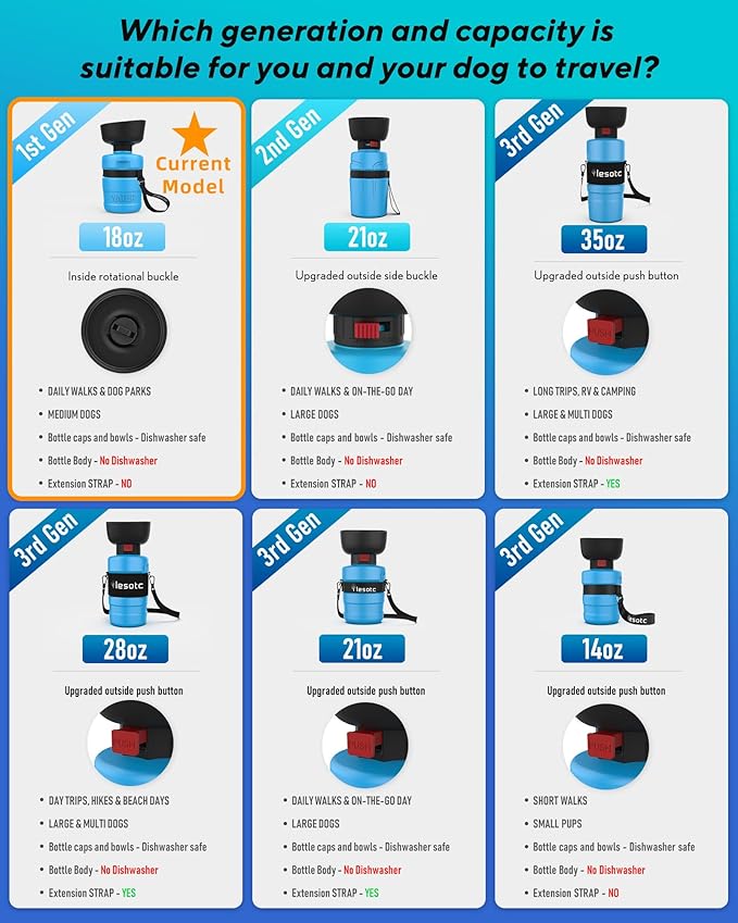 - Large Capacity: lesotc dog water bottle with a volume of 18oz/520ml. Dog travel water bottle can provide safe, fresh, and healthy water for puppy during long walking, travel, hiking, camping and other outdoor activities. It’s addition to your dog accessories, perfect for dog beach essentials and dog camping essentials