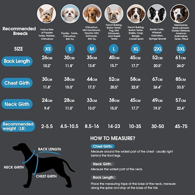 - SIZE INQUIRY: If you don't make sure which size to choose, you can measure your dog firstly then contact us for a recommended size. We are pleased to help you to choose a suitable dog coat for your furry friend.