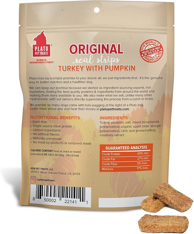 Plato Original Real Strips Turkey & Pumpkin Recipe 6oz, Natural (850002221411)