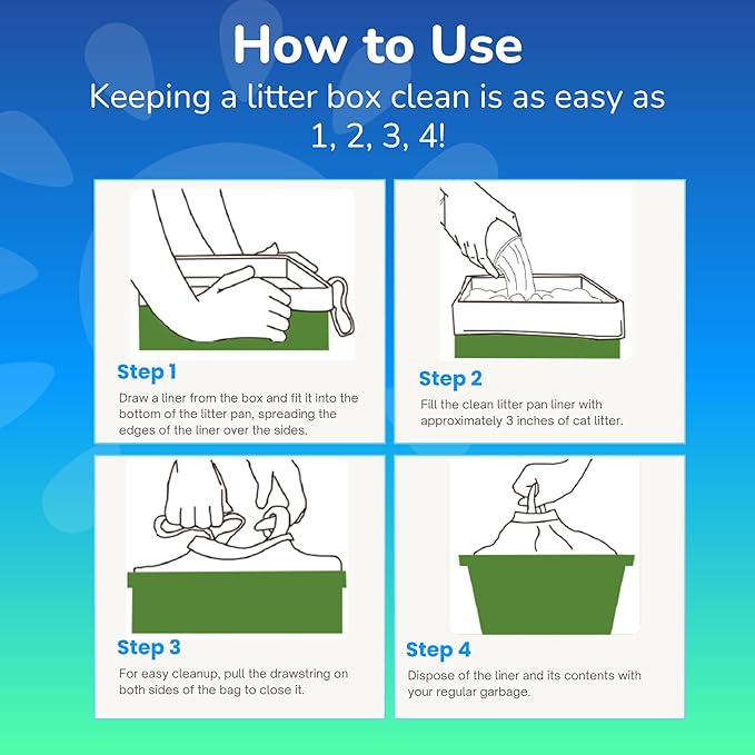 - [Bye bye flimsy liners] Our heavy-duty litter box bags feature scratch-guard technology and 60 micron plastic to prevent tears and make litter cleaning effortless. With durable drawstring handles, disposal is a breeze.