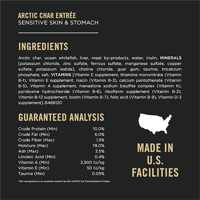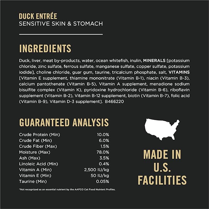 - No artificial colors or preservatives in canned sensitive stomach adult cat food with 25 essential vitamins and minerals plus taurine, an amino acid