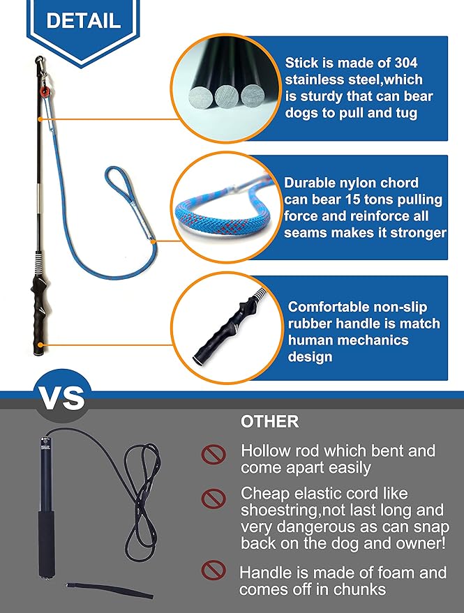 - Indestructible Rod: The durable training stick is made of 304 stainless steel,which is sturdy that can bear dogs extremely aggressive chewer to pull and tug. The play wand comes in two section, it is convenient to store and carry,and it is easy to setup,just twist two pole together.The non-slip rubber handle is easy handling and comfortable,which is match human mechanics design,and will not hurt your hands when you play with your dog.