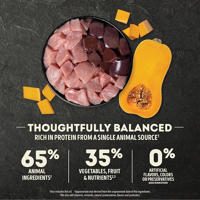 - Made with pork and pork liver, this grain free dog food is carefully crafted with 65 percent*** animal ingredients and 35 percent**** whole fruit, vegetables and nutrients to satisfy your dogโs cravings