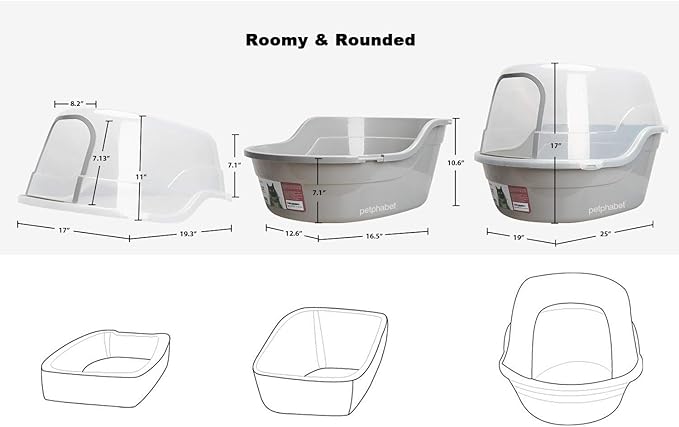 - Roomy & Rounded. Dimension when assembled tall cat litter box is 24.8"L x 20"W x 16.5"H. Door opening size 8.2 X 7.8 inches