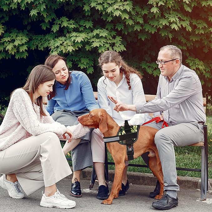 - ADJUST THE SIZE TO YOUR PETโS NEEDS Our Service Dog harness vest is fully adjustable so as to ensure a comfy yet snug fit. Forget about harnesses coming loose. Forget about seams and stitching falling apart. The quick release belly buckle facilitates use to the fullest and the top handle is great for added control and assistance.