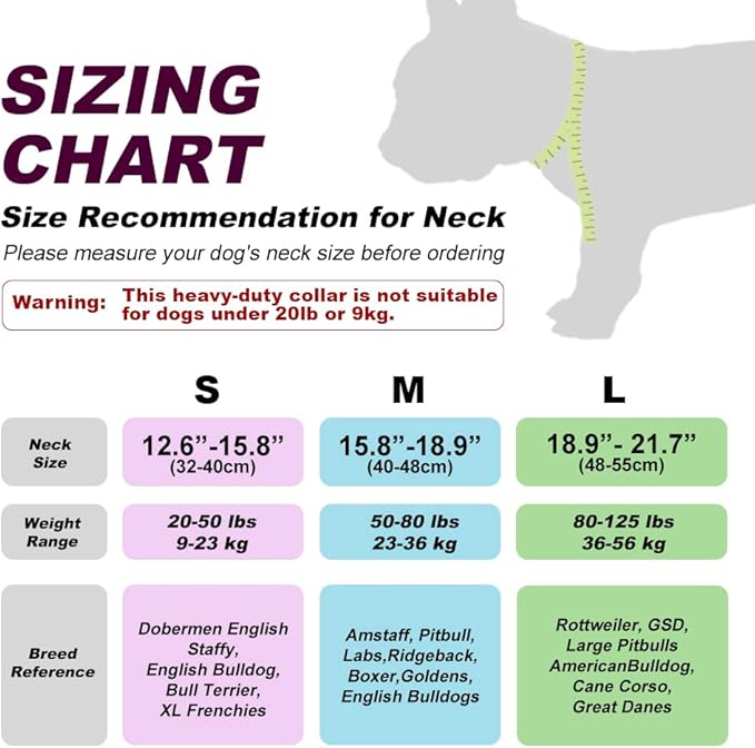 - Metal Collar for Dogs. This wide dog collar features 4 adjustable points, making it easy to adjust for a comfortable fit and attach to a dog leash or other dog accessories. Please refer to the size chart and carefully measure your dog’s neck before purchasing to ensure the dog collar fits well. Neck size range (S: 12.6”-15.8”, M: 15.8”-18.9”, L: 18.9”-21.7”)
