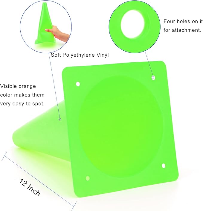 - Size - measures 12 inches in height, 6.7 inches in diameter. Four holes on safety cones for attachment, if it is a windy day, you do not need to worry it will blow all over the place.