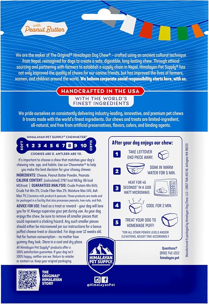 - PEANUT BUTTER FLAVOR: Included is one extra large, 5.3 oz peanut butter flavored Himalayan yak cheese stick - made using our traditional Himalayan cheese recipe, but with added bits of peanuts for more flavor! Ideal for dogs 55 pounds and over, not for dogs younger than 12 weeks.