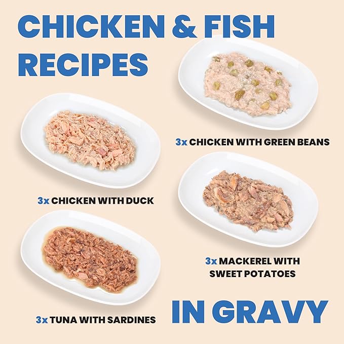 - CATS LOVE THE TASTE! Picky eaters will enjoy this high-protein recipe, made with meat/fish as first ingredient with Chicken & Duck, Tuna & Sardines, Chicken & Green Beans, and Mackerel & Sweet Potatoes. Grain-free delicious for happy cats and empty bowls