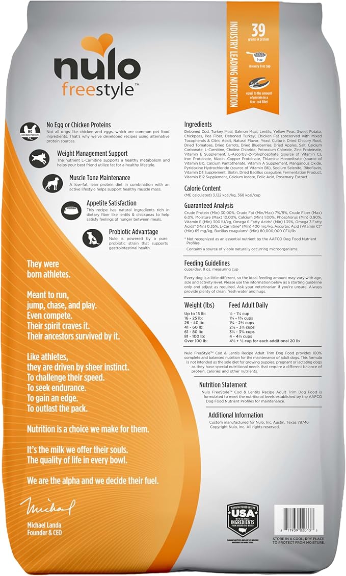 Nulo Freestyle Adult Trim Formula Dry Dog Food, Grain-Free Dog Kibble, Helps Promote Weight Management, With Healthy Digestive Aid BC30 Probiotic and L-Carnitine 26 Pound (Pack of 1)